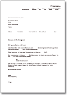 Mit dieser Vorlage für eine Mahnung knüpfen Sie an eine erste, vergeblich gebliebene Zahlungserinnerung an. Da Sie hiermit einen säumigen Kunden bereits zum zweiten Mal anschreiben, erheben Sie - bedingt durch den zusätzlichen Aufwand und einen eventuell entstandenen Schaden - ausserdem Verzugszinsen. Dennoch zeigen Sie sich im vorliegenden Schreiben kooperativ und kundenfreundlich, indem Sie etwa auf die Möglichkeit einer Ratenzahlung hinweisen.