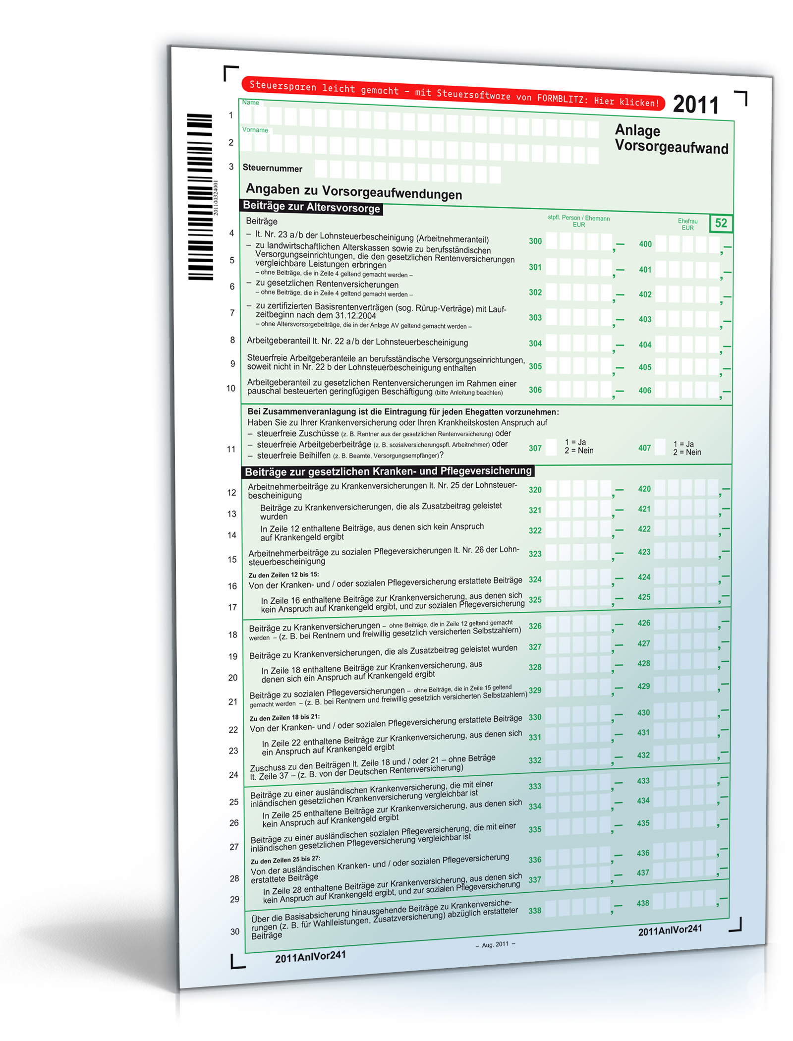 Steuerformular Anlage Vorsorgeaufwand (Angaben zu Vorsorgeaufwendungen) für die Einkommensteuererklärung 2011 sofort zum Download.