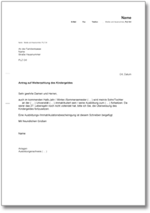 Normalerweise wird Kindergeld nur für Kinder bis zum 18. Lebensjahr gezahlt. Es kann allerdings bis zur Vollendung des 27. Lebensjahres Kindergeld weiter gezahlt werden, solange sich das Kind in einer Schul-, Berufsausbildung oder einem Studium befindet. Mit dieser Vorlage können Sie schnell und einfach bei der Familienkasse die Weiterzahlung des Kindergeldes wegen einer Ausbildung beantragen. Bitte legen Sie diesem Schreiben eine aktuelle Ausbildungs- oder Immatrikulationsbescheinigung bei.