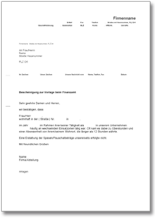 Mit diesem Muster können Sie als Arbeitgeber einem Arbeitnehmer seine häufige Abwesenheit vom Wohnort - aufgrund von Dienstreisen - bescheinigen. Das Schreiben dient zur Vorlage beim Finanzamt, um bei der Steuererklärung die Spesen geltend machen zu können.