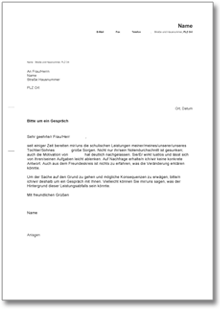 Mit diesem Musterschreiben können Sie nach einem schulischen Leistungsabfall Ihres Kindes um ein klärendes Gespräche mit dem Klassenlehrerer bzw. einem anderen Schulvertreter bitten.