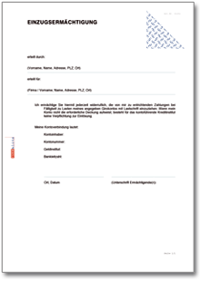Mit dieser Muster-Einzugsermächtigung können Sie eine Person, eine Firma oder eine Institution dazu ermächtigen, bestimmte Zahlungen von Ihrem Konto einzuziehen, solange dieses Konto eine ausreichende Deckung aufweist.