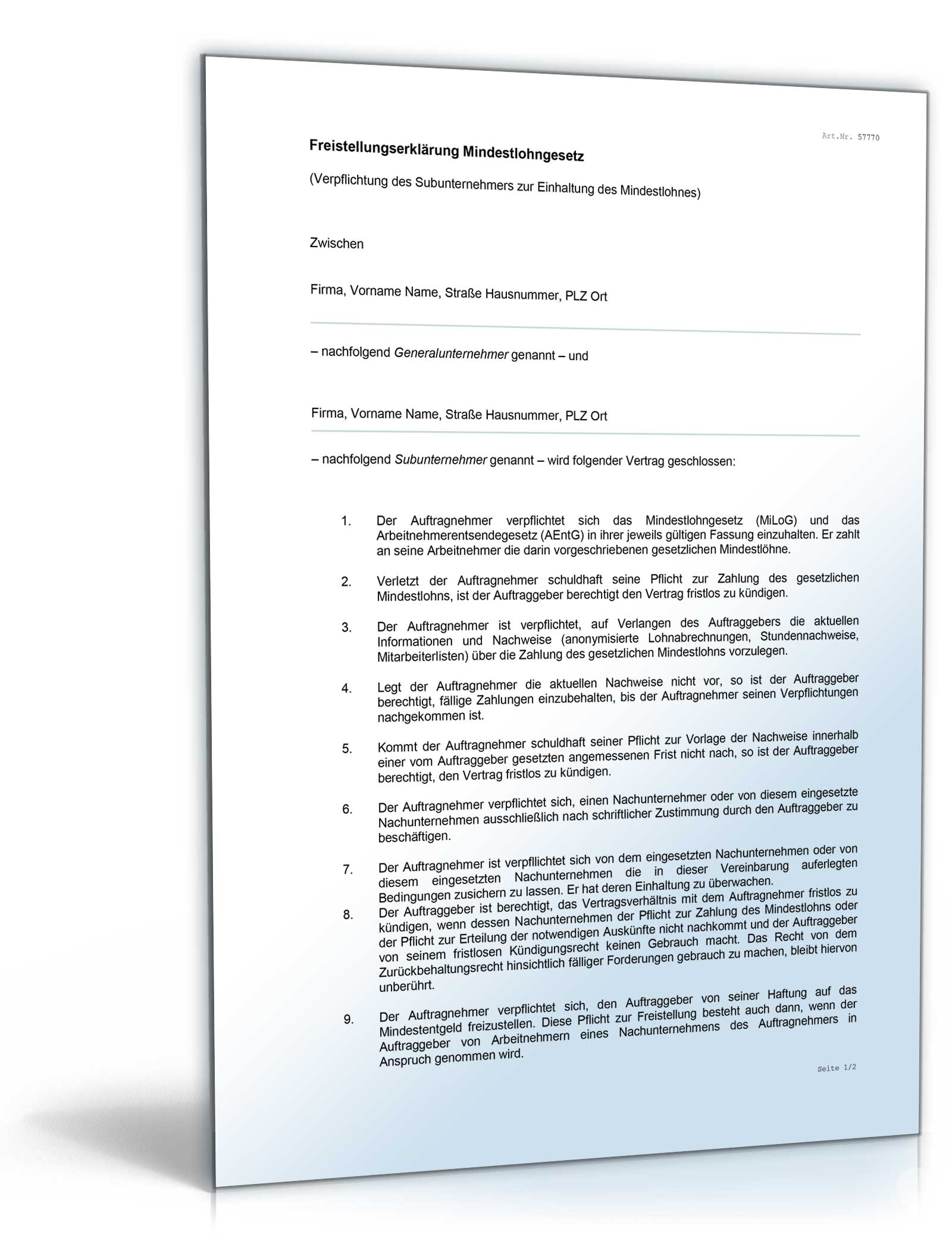 Freistellungserklärung Mindestlohngesetz