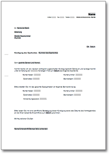 Dieses Schreiben ist einwandfrei und kann problemlos genutzt werden, um ein Sparkonto zu kündigen. Es enthält alle sämtlichen Informationen und kann ganz einfach am Bildschirm vervollständigt werden. Einfach downloaden ausfüllen und verwenden.