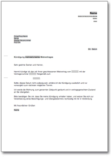 vorlage für eine ordentliche, fristgemässe Kündigung des Mietvertrags seitens des Mieters sofort zum Download.