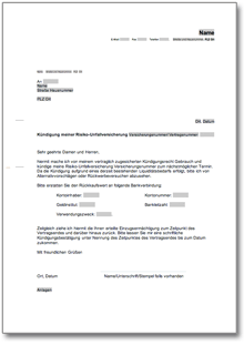 Vordruck für eine Kündigung einer Risikounfallversicherung. Einfach zum Download.
