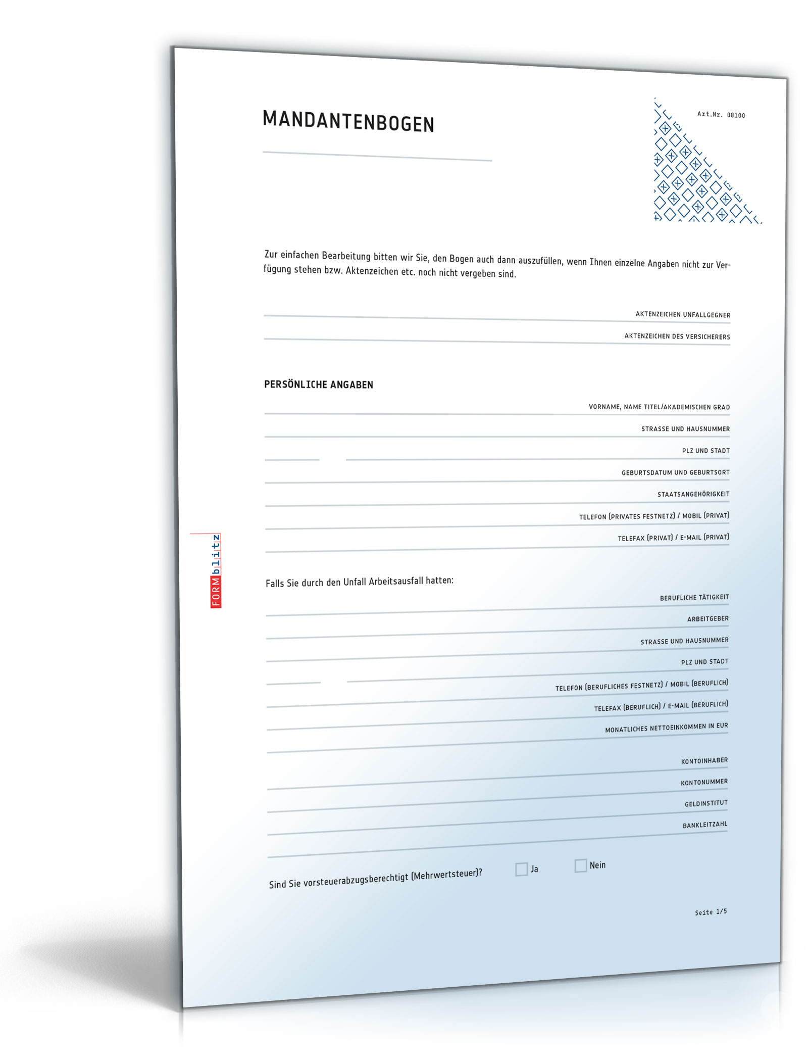 Mit diesem Stammblatt nehmen Sie als Rechtsanwalt sämtliche Daten von Mandanten bei Verkehrsangelegenheiten auf. So haben Sie alle Informationen, wie Kommunikations- und Versicherungsdaten des Mandaten, Daten zu Unfall, Kraftfahrzeug, Verkehrsteilnehmern und Zeugen, bereits vor der ersten Besprechung vorliegen. Nach dem Download brauchen Sie unsere Muster-Vorlage nur noch vom Mandanten ausfüllen lassen - fertig!