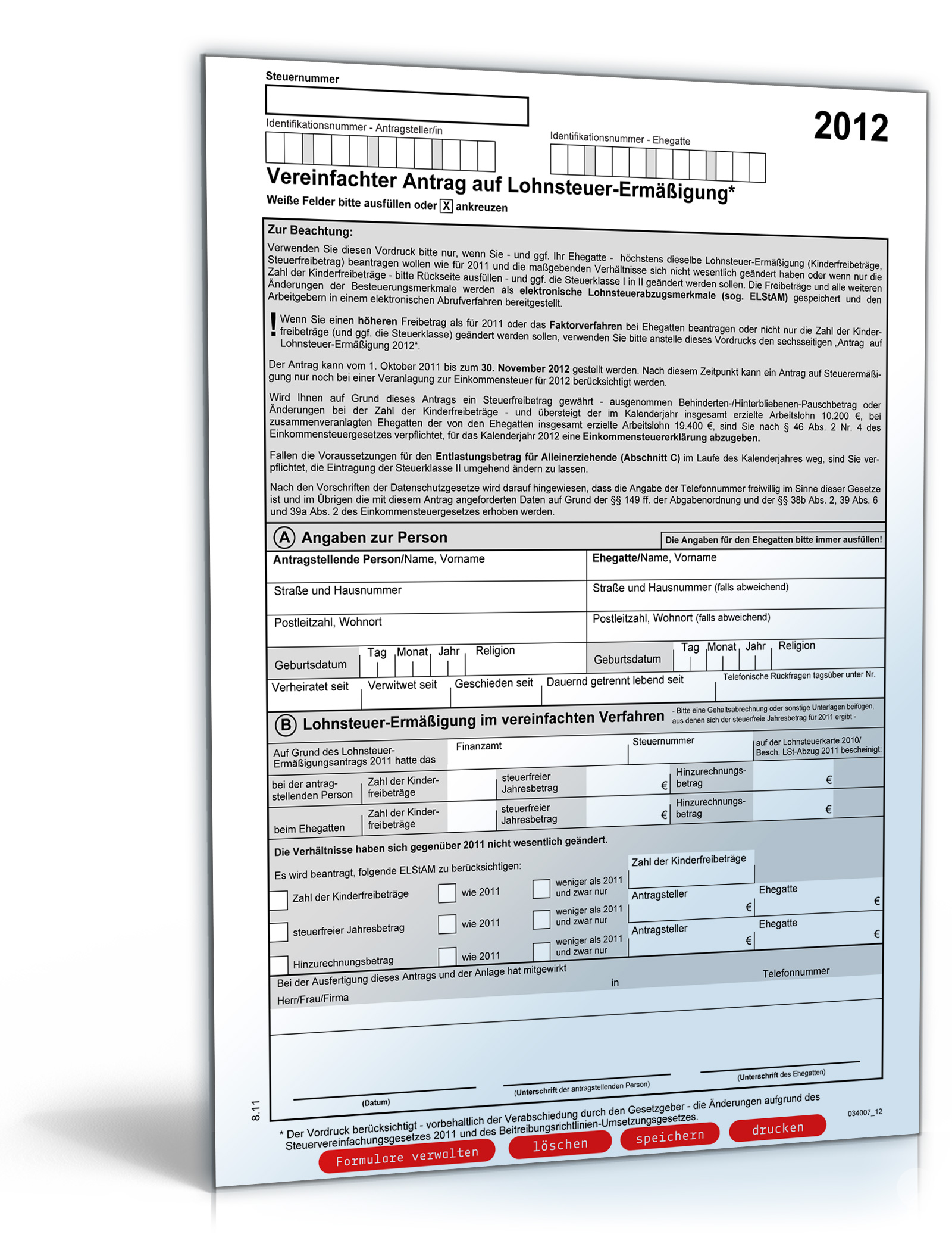 Wenn Sie 2011 bereits eine Lohnsteuerermässigung beantragt hatten und sich die massgeblichen Verhältnisse nicht wesentlich geändert haben, können Sie 2012 den Vereinfachten Antrag auf Lohnsteuerermässigung verwenden. Der Antrag enthält Formularfelder und kann am PC ausgefüllt werden. Die Eingegebenen Daten lassen sich mit dem Acrobat Reader speichern.