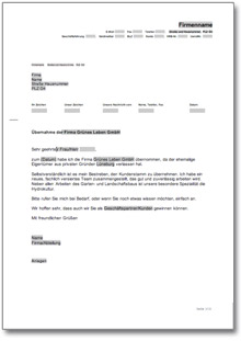 Will man den Kundenstamm einer übernommenen Firma auch an sich binden, so muss man erstmal auf sich aufmerksam machen. Mit diesem Muster-Werbebrief für ein Gartenbauunternehmen können Sie sich formvollendet als neuer Chef vorstellen. Sie müssen nur Ihre persönlichen Daten eintragen und schon haben Sie einen Werbebrief, der seine Wirkung nicht verfehlen wird.
