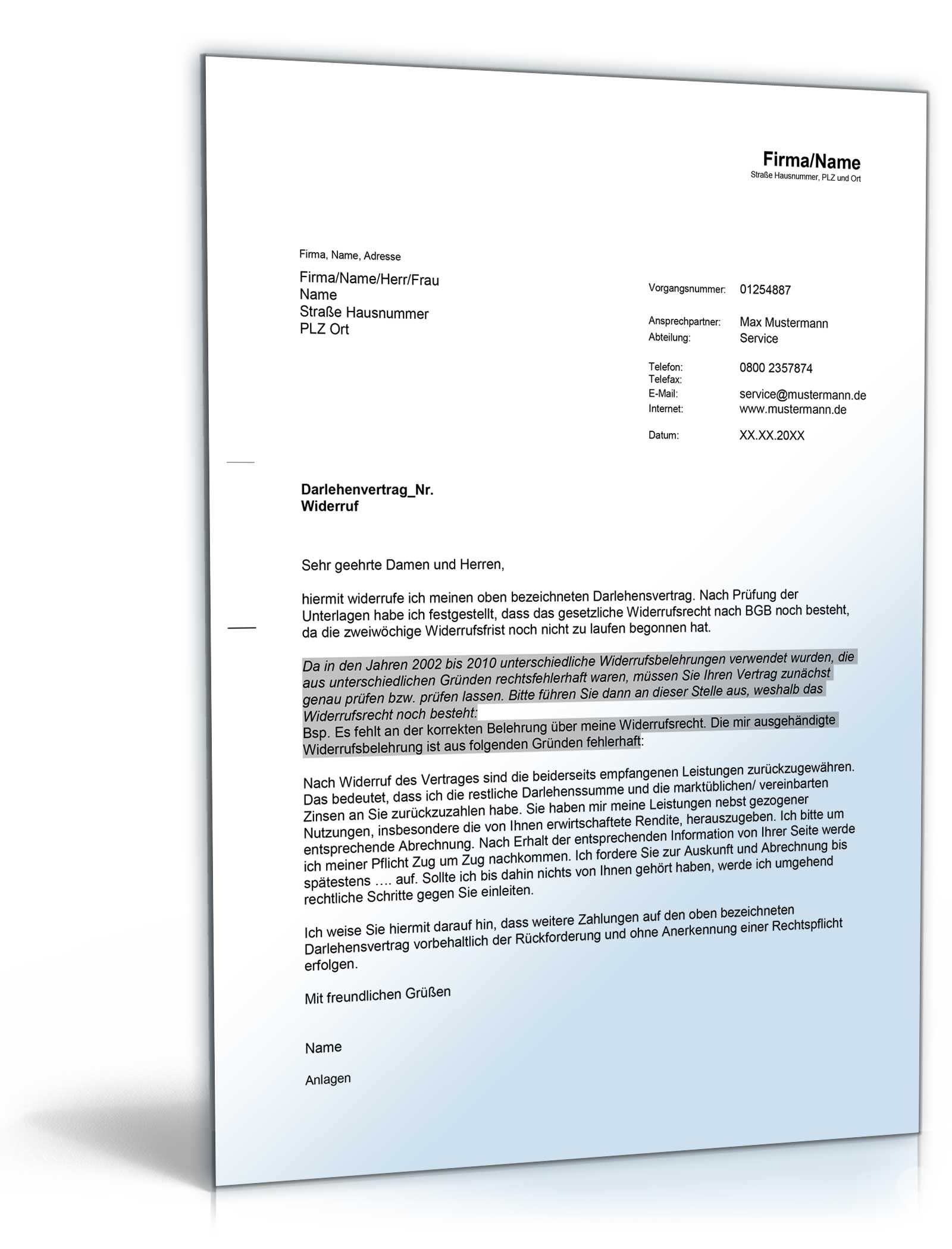Widerruf Immobilienkredit: Professionelle Vorlage sofort zum Download. Muster für Kreditnehmer aus den Jahren 2002 bis 2010 hier als DOC & PDF herunterladen.